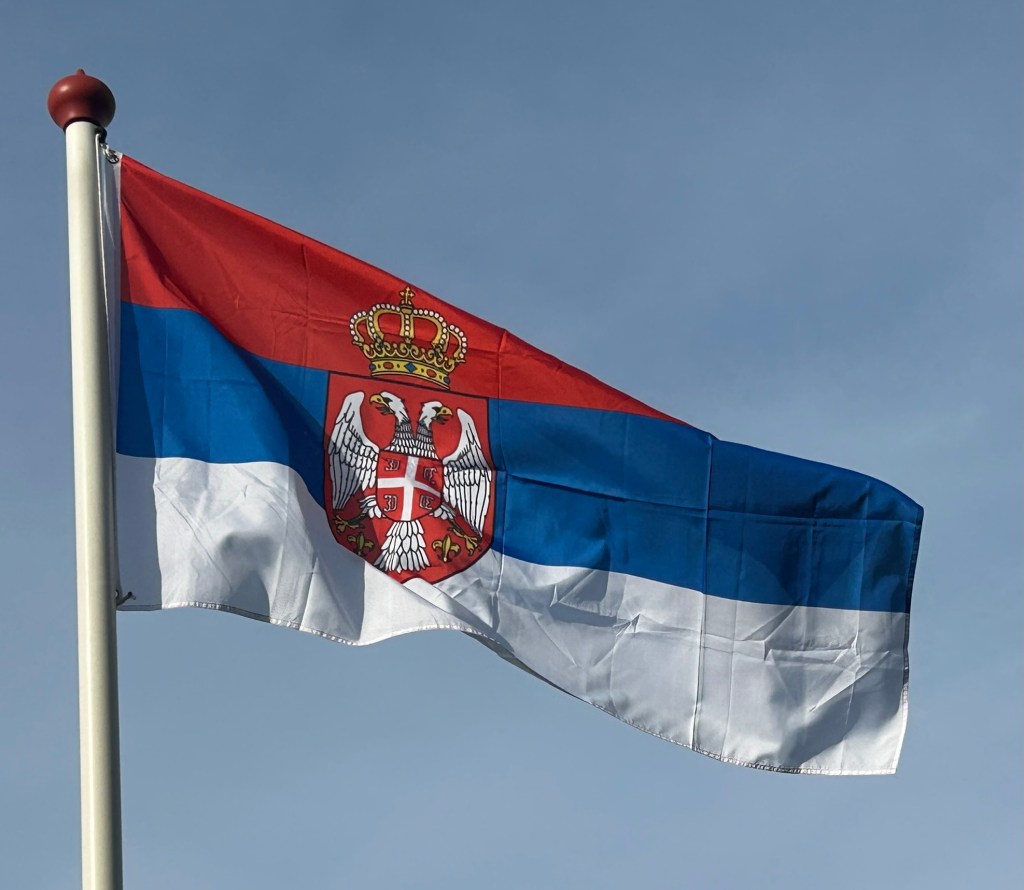 De vlag van Servië is een horizontale driekleur in rood-blauw-wit met het staatswapen iets links van het midden daaroverheen.