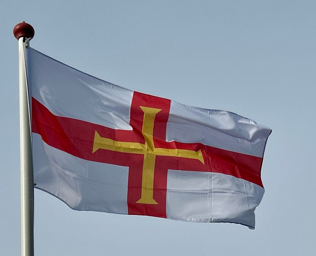 De vlag van Guernsey is wit met een rood St. George’s Cross (Sint Joriskruis) waaroverheen een goud of geel breedvoetig kruis met afgevlakte voeten.
