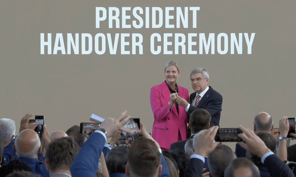 Thomas Bach draagt de Olympische voorzitterssleutel over aan zijn opvolgster Kirsten Coventry op 23 juni 2025 in Lausanne, Zwitserland (screenshot)