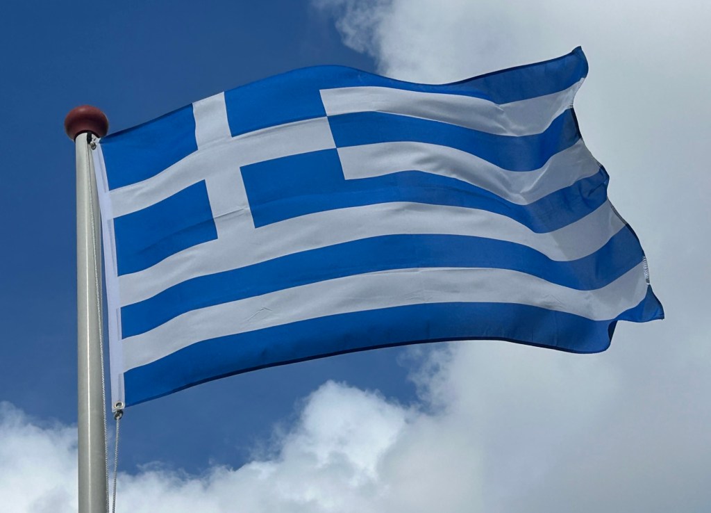 De streepvlag werd in 1833 gepromoveerd tot nationale vlag (naast de kruisvlag dus). Het kruis in de vlag herinnert aan het christelijke geloof, de kleuren gaan terug op de eerste Griekse koning Otto I. De strepen worden op verschillende manieren uitgelegd. Ze staan voor de lucht en de zee (blauw) en de rechtvaardigheid van de vrijheidsstrijd (wit). Dat er negen stepen zijn verwijst naar de vrijheidsleus van toen, Vrijheid of dood, die in het Grieks negen lettergrepen heeft. Het duidt ook op de negen jaar die de vrijheidsstrijd duurde. Als laatste link zou Achilles negen strepen op zijn schild gehad hebben.