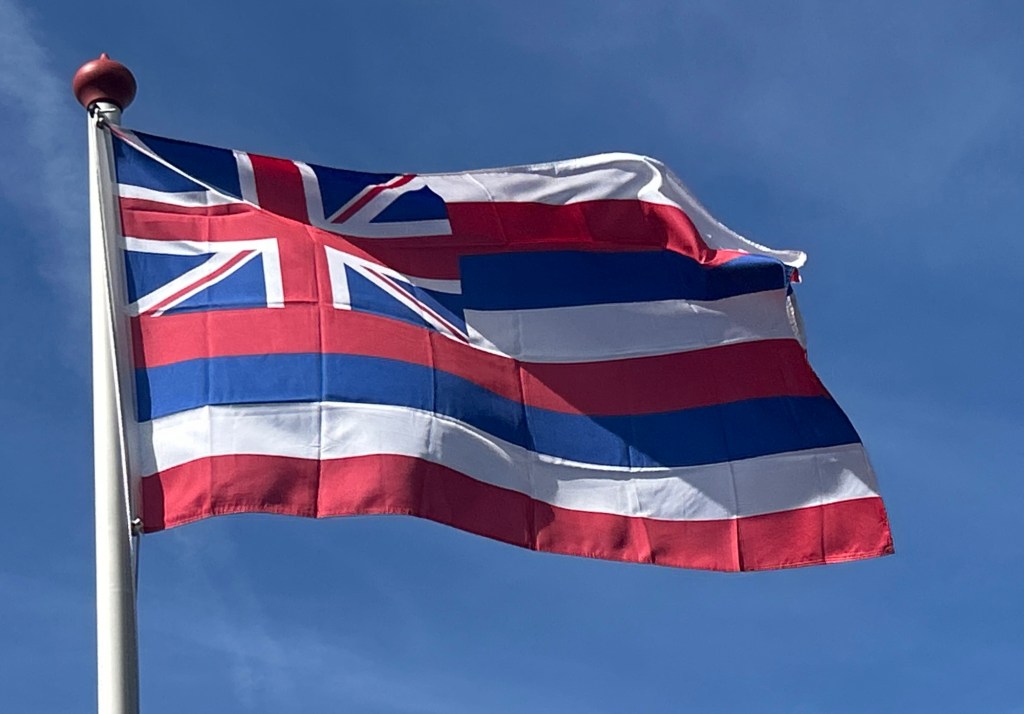 De vlag van Hawaii is een beetje een vreemde. Mensen die hem nooit eerder gezien hebben kunnen zich niet voorstellen dat dát de Hawaiiaanse vlag is. Het doek vertoont acht gelijke horizontale banen: wit, rood, blauw, wit, rood, blauw, wit en rood. Het gekke zit ‘m in de Britse Union Flag of Union Jack in het kanton.