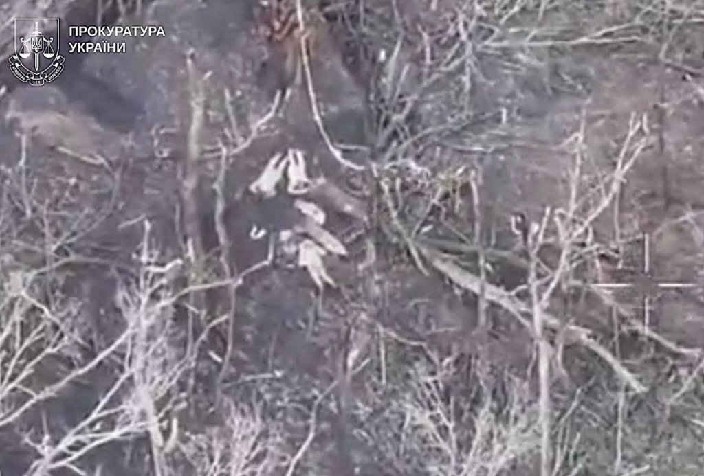 De Oekraïense autoriteiten publiceerden een foto die vermoedelijk door een drone is gemaakt en waarop vier lichamen in een open veld te zien zijn.