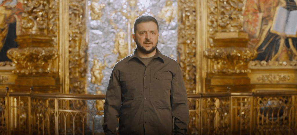 President Zelensky tijdens zijn toespraak tijdens het orthodoxe Pasen (screenshot)