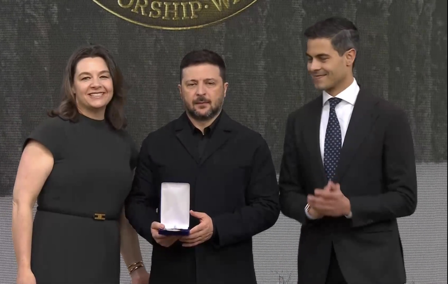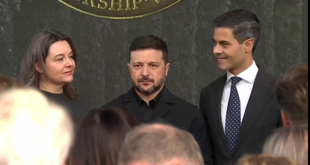 President Zelensky ontving de International Freedoms Award uit honden van Elizabeth Roosevelt Johnston (links), premier Jetten (rechts) leidde de toekenning in met een rede (screenshot)