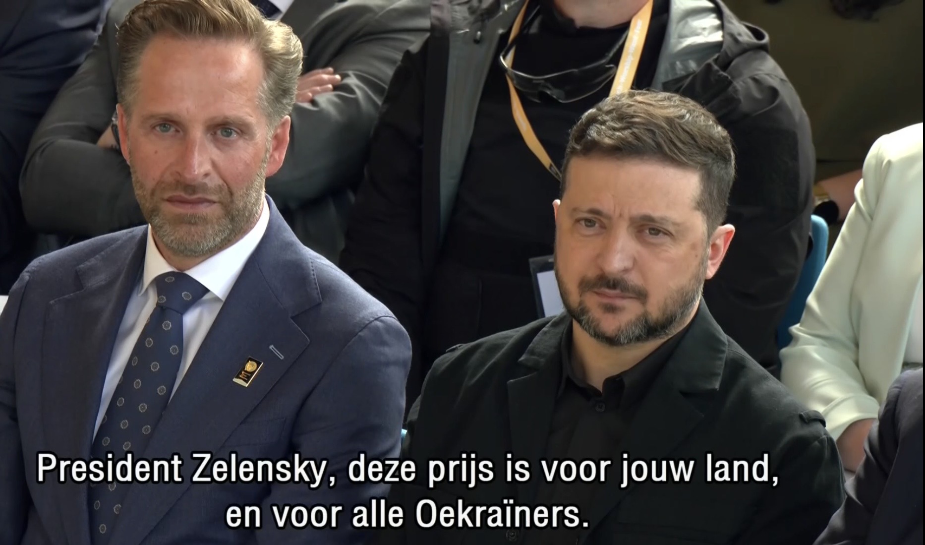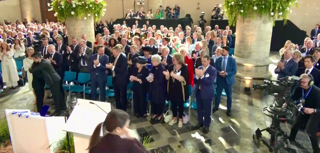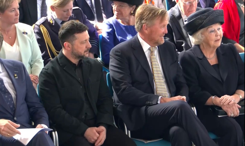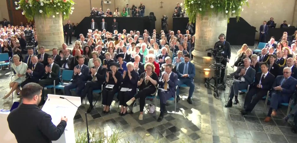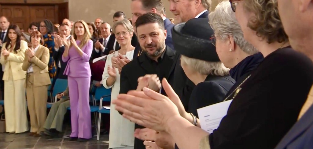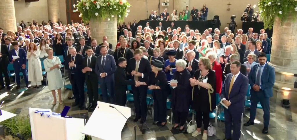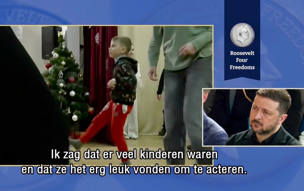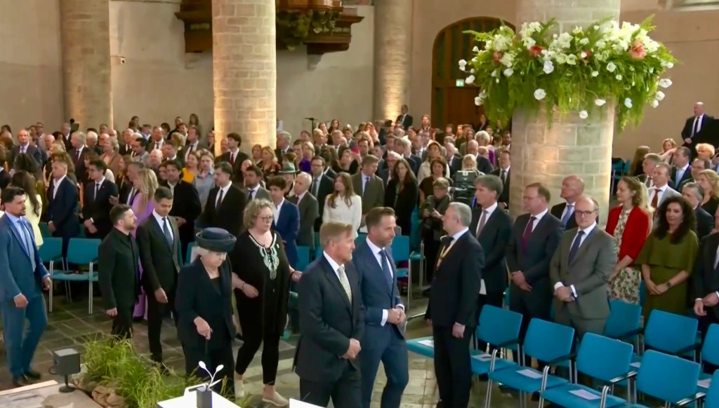 Aankomst van koning Willem-Alexander en prinses Beatrix op de Balans, net buiten het AbdijcomplexCommissaris van de Koning in Zeeland, Hugo de Jonge, begroet premier Rob JettenDe koning, Commissaris van de Koning Hugo de Jonge, prinses Beatrix, president Zelensky en (nog net zichtbaar) premier Jetten lopen door de kloostergangen naar de Nieuwe KerkBinnenkomst in de Middelburgse Nieuwe KerkPresident Zelensky bekijkt het programmaDe Zeeuwse Commissaris van de Koning, Hugo de Jonge, tijdens zijn inleidingDe president en de koningDe president worstelde zichtbaar met zijn emoties tijdens een filmpje waarin Oekraïense burgers aan het woord kwamen over hoe ze, ondanks alles toch een zo normaal mogelijk leven proberen te leiden Het filmpje kan op een luid applaus rekenenPremier Jetten tijdens zijn toespraak voorafgaand aan de uitreiking van de International Four Freedoms AwardPremier Jetten sluit zijn toespraak afNa de uitreiking van de onderscheiding is er een staande ovatie voor de presidentTijdens het langdurige applaus voor de presidentDe president houdt vervolgens een toespraak….…waarbij hij allereerst om een minuut stilte vraagt voor de slachtoffers van de Russische aanval van de nacht ervoor (zie ook verderop in Vlagblog)President Zelensky tijdens zijn toespraak onder ‘toeziend oog’ van president RooseveltDe president sluit zijn rede af, waarna opnieuw een langdurig applaus zijn deel is……en hij een stevige omhelzing van premier Jetten krijgtZelensky en JettenHet applaus blijft aanhouden – als tweede van links zien we Gisèle Pelicot, de Française die jarenlang gedrogeerd en verkracht werd door haar man en talloze andere mannen; de Four Freedoms Award voor Vrijwaring van Vrees werd haar dit jaar toegekendPrinses Beatrix feliciteert president Zelensky met zijn onderscheiding, links in het wit met ambtsketen zien we de Middelburgse burgemeester Yvonne van MastrigtDe president bleef nog voor de overige medaille-uitreikingen