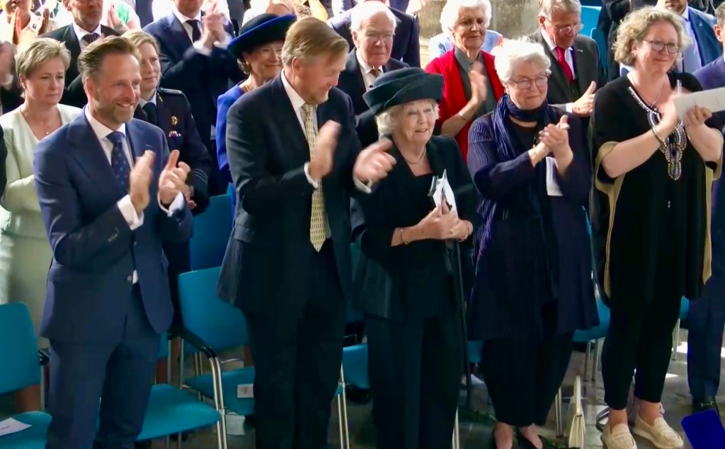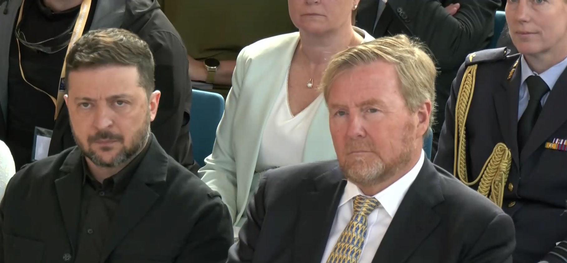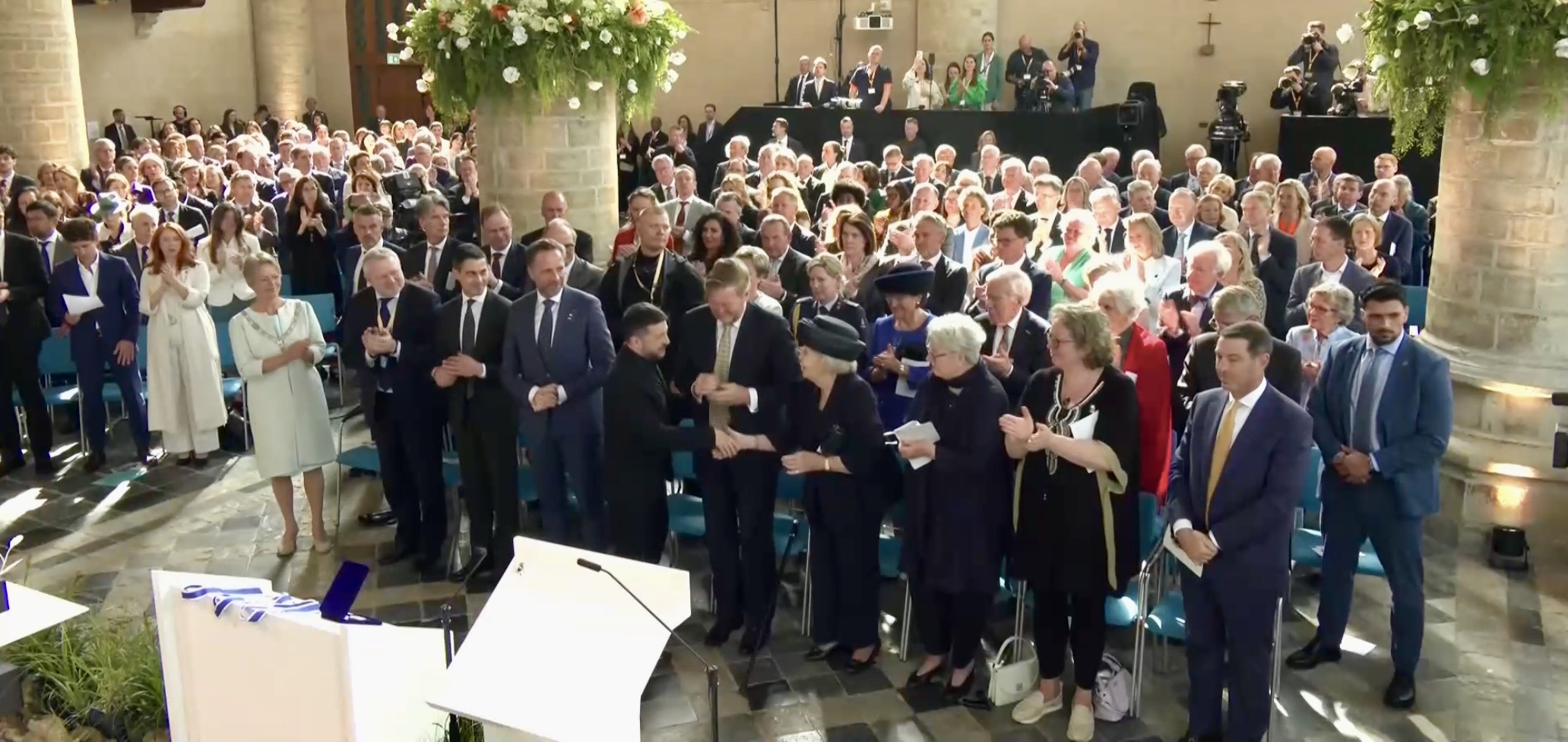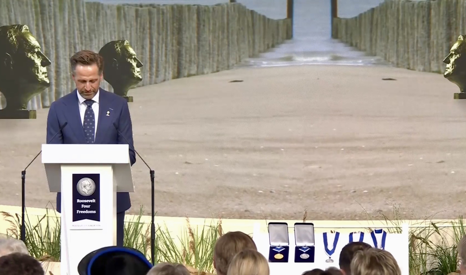 Aankomst van koning Willem-Alexander en prinses Beatrix op de Balans, net buiten het AbdijcomplexCommissaris van de Koning in Zeeland, Hugo de Jonge, begroet premier Rob JettenDe koning, Commissaris van de Koning Hugo de Jonge, prinses Beatrix, president Zelensky en (nog net zichtbaar) premier Jetten lopen door de kloostergangen naar de Nieuwe KerkBinnenkomst in de Middelburgse Nieuwe KerkPresident Zelensky bekijkt het programmaDe Zeeuwse Commissaris van de Koning, Hugo de Jonge, tijdens zijn inleidingDe president en de koningDe president worstelde zichtbaar met zijn emoties tijdens een filmpje waarin Oekraïense burgers aan het woord kwamen over hoe ze, ondanks alles toch een zo normaal mogelijk leven proberen te leiden Het filmpje kan op een luid applaus rekenenPremier Jetten tijdens zijn toespraak voorafgaand aan de uitreiking van de International Four Freedoms AwardPremier Jetten sluit zijn toespraak afNa de uitreiking van de onderscheiding is er een staande ovatie voor de presidentTijdens het langdurige applaus voor de presidentDe president houdt vervolgens een toespraak….…waarbij hij allereerst om een minuut stilte vraagt voor de slachtoffers van de Russische aanval van de nacht ervoor (zie ook verderop in Vlagblog)President Zelensky tijdens zijn toespraak onder ‘toeziend oog’ van president RooseveltDe president sluit zijn rede af, waarna opnieuw een langdurig applaus zijn deel is……en hij een stevige omhelzing van premier Jetten krijgtZelensky en JettenHet applaus blijft aanhouden – als tweede van links zien we Gisèle Pelicot, de Française die jarenlang gedrogeerd en verkracht werd door haar man en talloze andere mannen; de Four Freedoms Award voor Vrijwaring van Vrees werd haar dit jaar toegekendPrinses Beatrix feliciteert president Zelensky met zijn onderscheiding, links in het wit met ambtsketen zien we de Middelburgse burgemeester Yvonne van MastrigtDe president bleef nog voor de overige medaille-uitreikingen