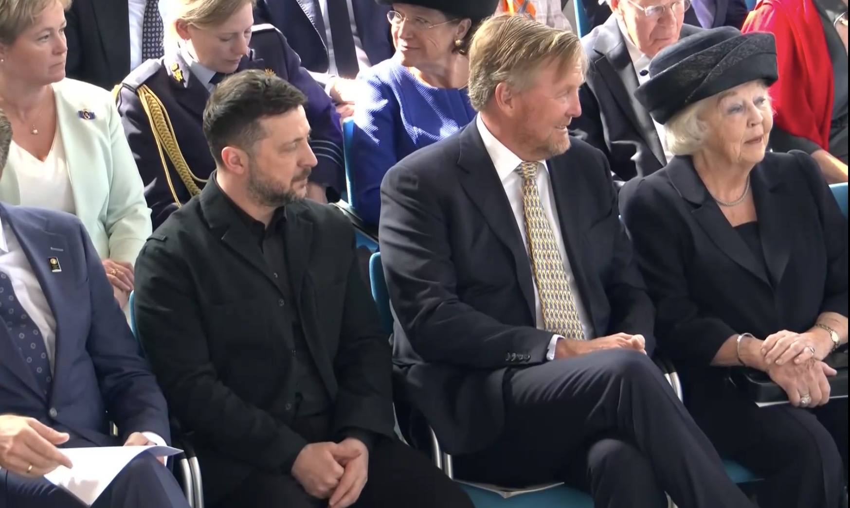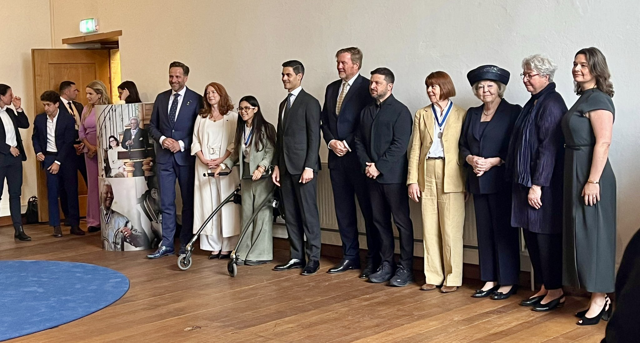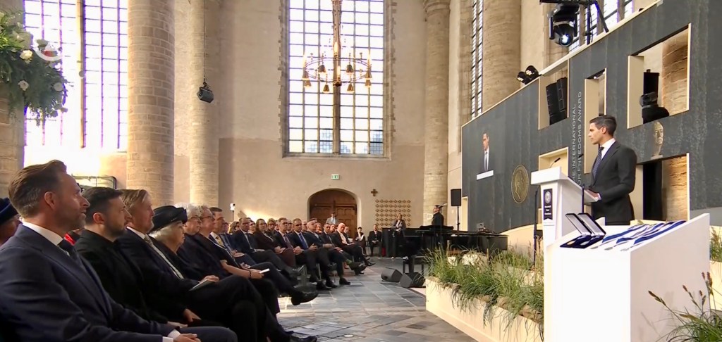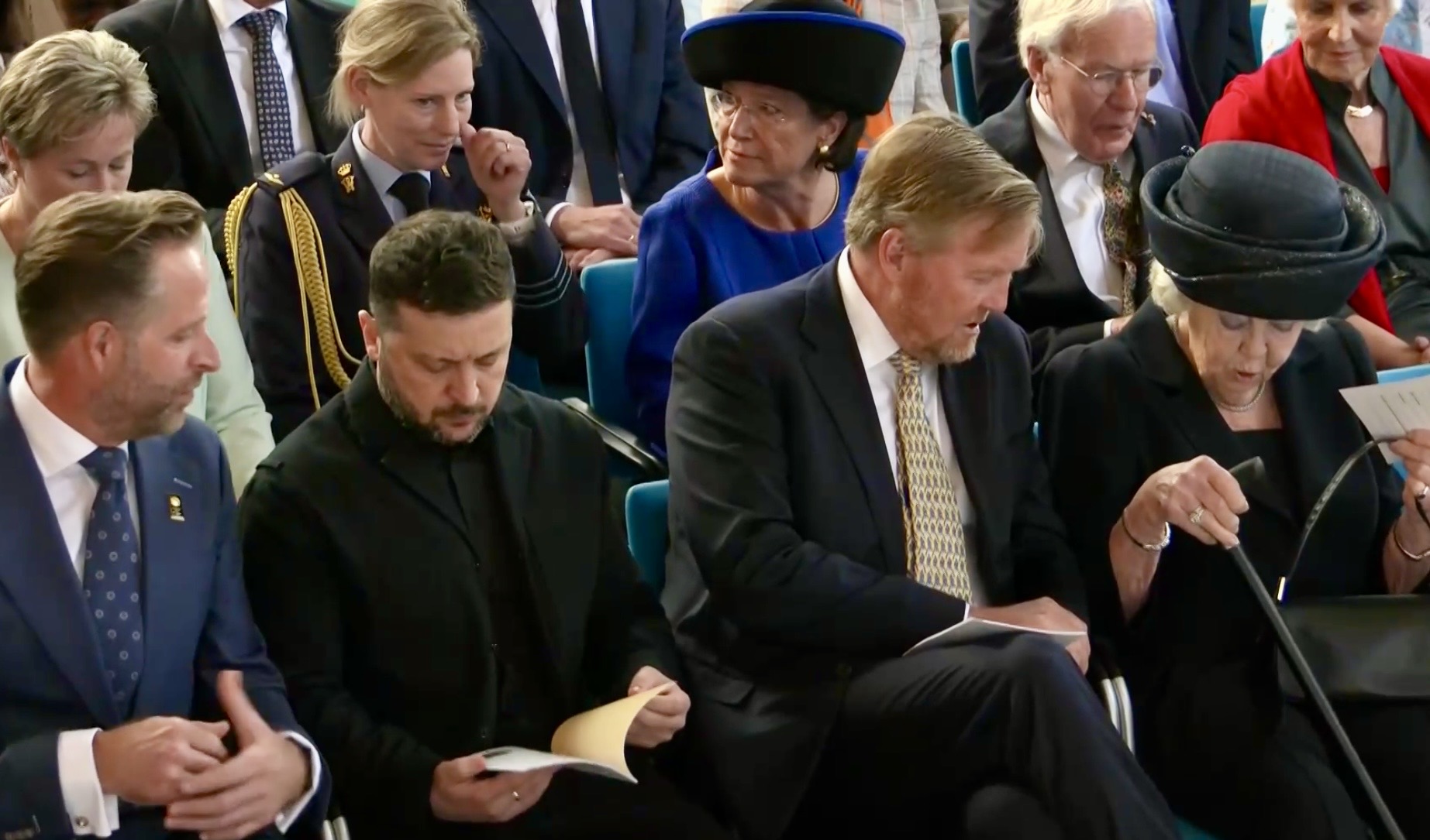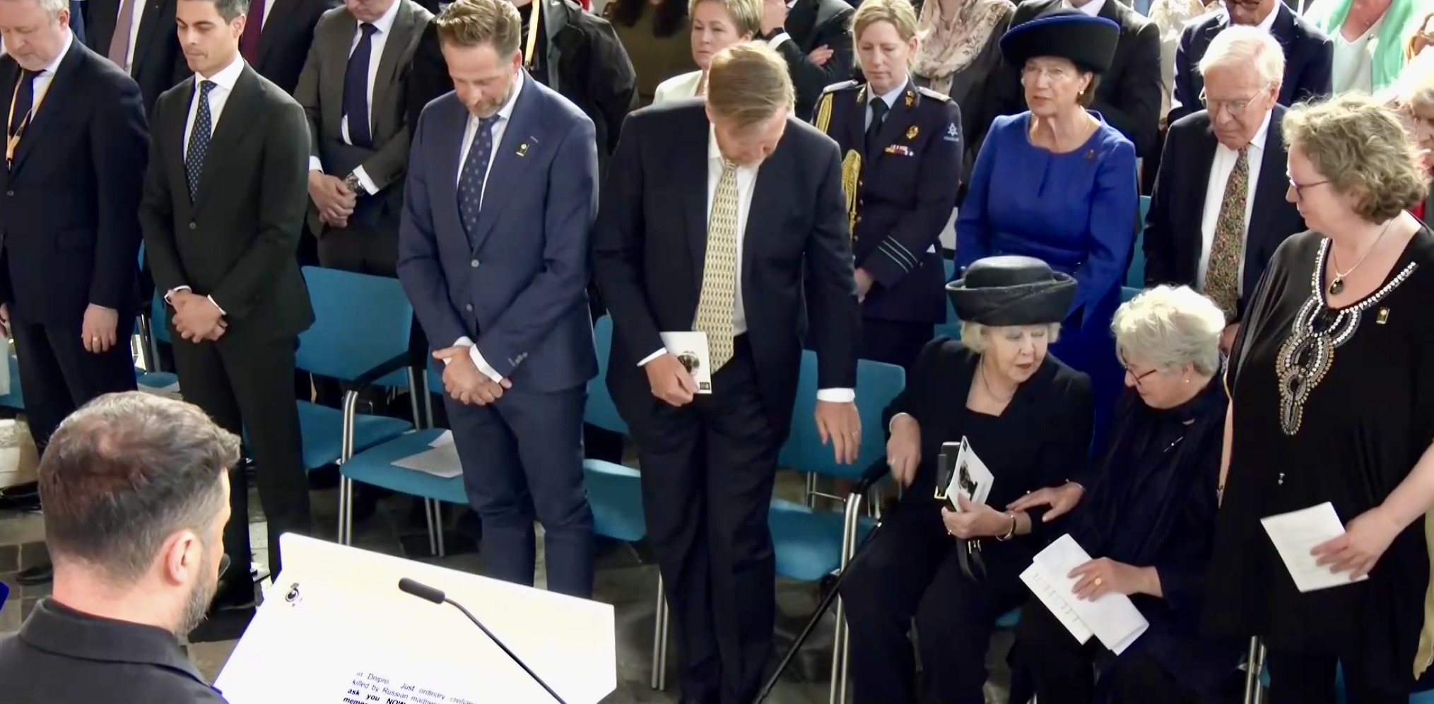 Aankomst van koning Willem-Alexander en prinses Beatrix op de Balans, net buiten het AbdijcomplexCommissaris van de Koning in Zeeland, Hugo de Jonge, begroet premier Rob JettenDe koning, Commissaris van de Koning Hugo de Jonge, prinses Beatrix, president Zelensky en (nog net zichtbaar) premier Jetten lopen door de kloostergangen naar de Nieuwe KerkBinnenkomst in de Middelburgse Nieuwe KerkPresident Zelensky bekijkt het programmaDe Zeeuwse Commissaris van de Koning, Hugo de Jonge, tijdens zijn inleidingDe president en de koningDe president worstelde zichtbaar met zijn emoties tijdens een filmpje waarin Oekraïense burgers aan het woord kwamen over hoe ze, ondanks alles toch een zo normaal mogelijk leven proberen te leiden Het filmpje kan op een luid applaus rekenenPremier Jetten tijdens zijn toespraak voorafgaand aan de uitreiking van de International Four Freedoms AwardPremier Jetten sluit zijn toespraak afNa de uitreiking van de onderscheiding is er een staande ovatie voor de presidentTijdens het langdurige applaus voor de presidentDe president houdt vervolgens een toespraak….…waarbij hij allereerst om een minuut stilte vraagt voor de slachtoffers van de Russische aanval van de nacht ervoor (zie ook verderop in Vlagblog)President Zelensky tijdens zijn toespraak onder ‘toeziend oog’ van president RooseveltDe president sluit zijn rede af, waarna opnieuw een langdurig applaus zijn deel is……en hij een stevige omhelzing van premier Jetten krijgtZelensky en JettenHet applaus blijft aanhouden – als tweede van links zien we Gisèle Pelicot, de Française die jarenlang gedrogeerd en verkracht werd door haar man en talloze andere mannen; de Four Freedoms Award voor Vrijwaring van Vrees werd haar dit jaar toegekendPrinses Beatrix feliciteert president Zelensky met zijn onderscheiding, links in het wit met ambtsketen zien we de Middelburgse burgemeester Yvonne van MastrigtDe president bleef nog voor de overige medaille-uitreikingen