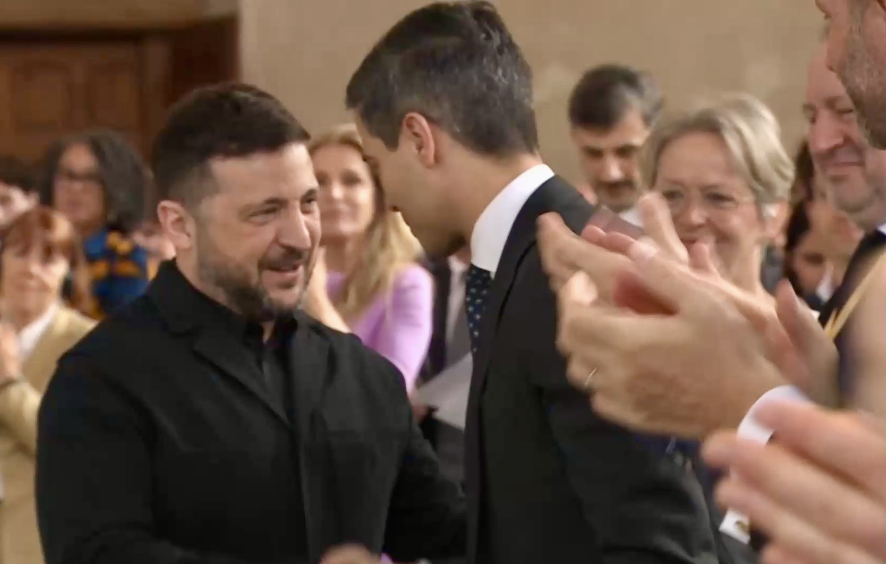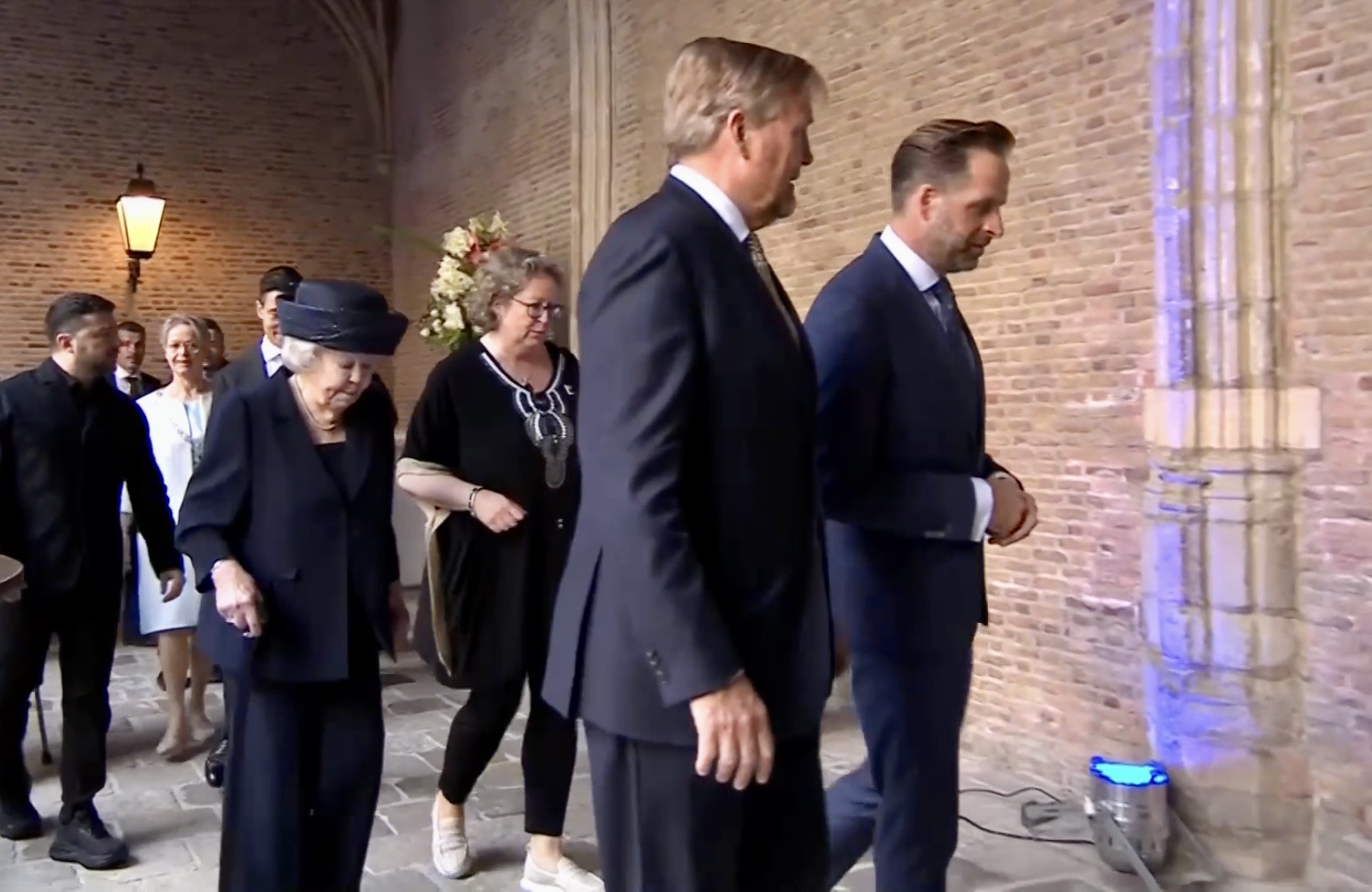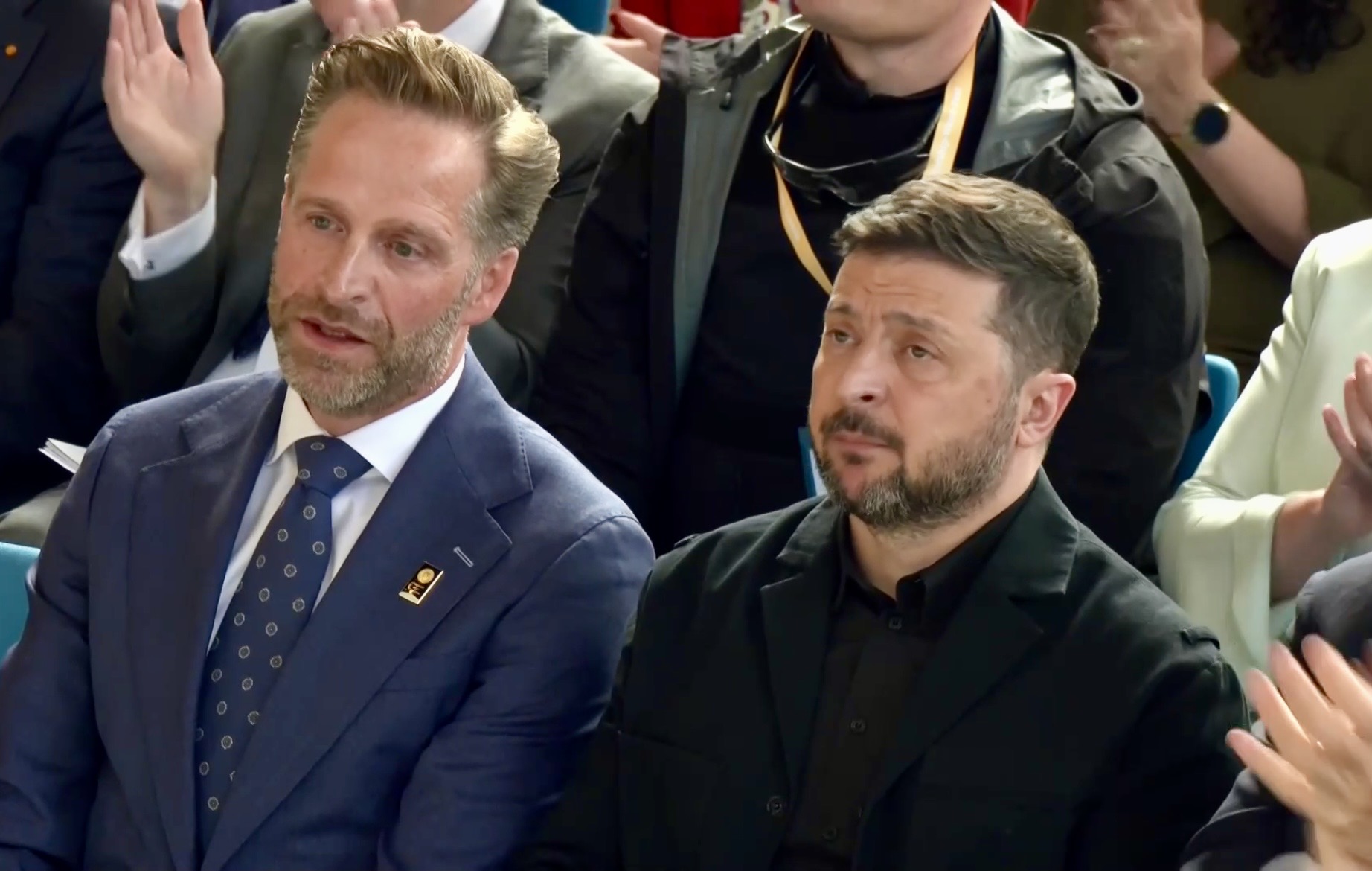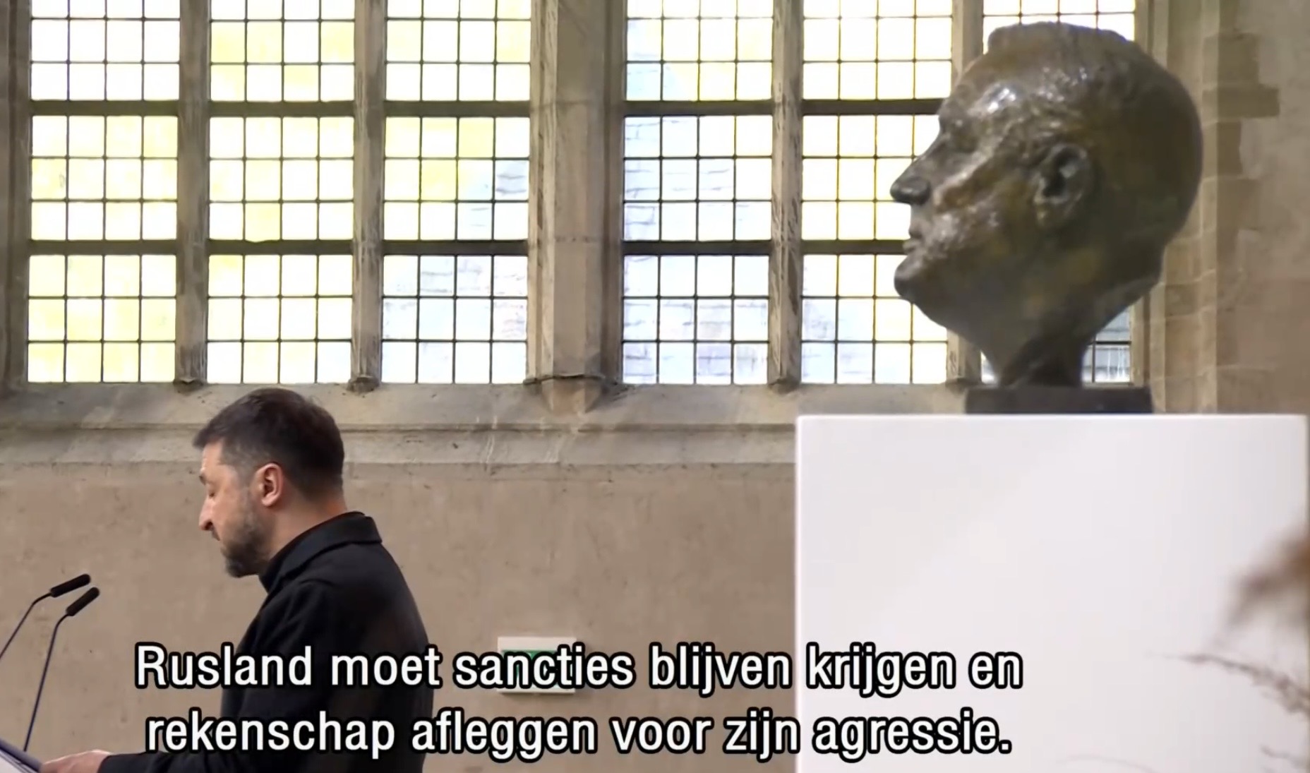Aankomst van koning Willem-Alexander en prinses Beatrix op de Balans, net buiten het AbdijcomplexCommissaris van de Koning in Zeeland, Hugo de Jonge, begroet premier Rob JettenDe koning, Commissaris van de Koning Hugo de Jonge, prinses Beatrix, president Zelensky en (nog net zichtbaar) premier Jetten lopen door de kloostergangen naar de Nieuwe KerkBinnenkomst in de Middelburgse Nieuwe KerkPresident Zelensky bekijkt het programmaDe Zeeuwse Commissaris van de Koning, Hugo de Jonge, tijdens zijn inleidingDe president en de koningDe president worstelde zichtbaar met zijn emoties tijdens een filmpje waarin Oekraïense burgers aan het woord kwamen over hoe ze, ondanks alles toch een zo normaal mogelijk leven proberen te leiden Het filmpje kan op een luid applaus rekenenPremier Jetten tijdens zijn toespraak voorafgaand aan de uitreiking van de International Four Freedoms AwardPremier Jetten sluit zijn toespraak afNa de uitreiking van de onderscheiding is er een staande ovatie voor de presidentTijdens het langdurige applaus voor de presidentDe president houdt vervolgens een toespraak….…waarbij hij allereerst om een minuut stilte vraagt voor de slachtoffers van de Russische aanval van de nacht ervoor (zie ook verderop in Vlagblog)President Zelensky tijdens zijn toespraak onder ‘toeziend oog’ van president RooseveltDe president sluit zijn rede af, waarna opnieuw een langdurig applaus zijn deel is……en hij een stevige omhelzing van premier Jetten krijgtZelensky en JettenHet applaus blijft aanhouden – als tweede van links zien we Gisèle Pelicot, de Française die jarenlang gedrogeerd en verkracht werd door haar man en talloze andere mannen; de Four Freedoms Award voor Vrijwaring van Vrees werd haar dit jaar toegekendPrinses Beatrix feliciteert president Zelensky met zijn onderscheiding, links in het wit met ambtsketen zien we de Middelburgse burgemeester Yvonne van MastrigtDe president bleef nog voor de overige medaille-uitreikingen