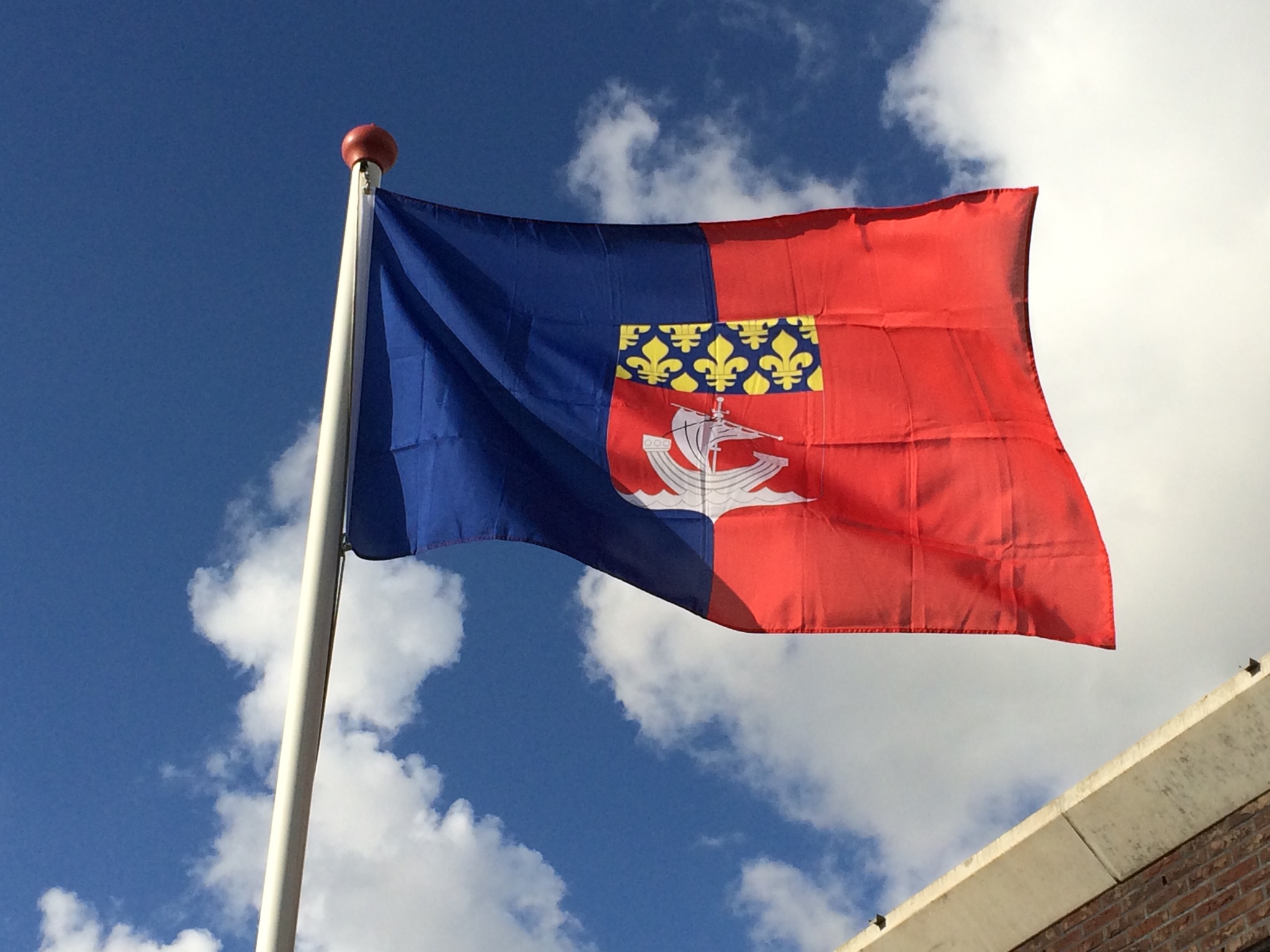 De tweede versie heeft het wapen van Parijs midden op de vlag en toont een schip: het staat voor de Parijse handel en is afkomstig van het plaatselijke schippersgilde. Het schildhoofd toont gouden fleur-de-lys tegen een blauwe achtergrond, akomstig van de Franse koningen.