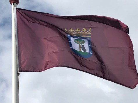 De vlag van Madrid is karmozijn van kleur, met in het midden het stadswapen.