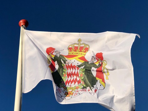 De “bonus” is de prinselijke staatsvlag van Monaco, die ook vanaf het paleis wappert als Albert aanwezig is en die in de tweede helft van de middag bij Vlagblog zal wapperen. Deze vlag met wapen was tot 1881 de nationale vlag van het land.