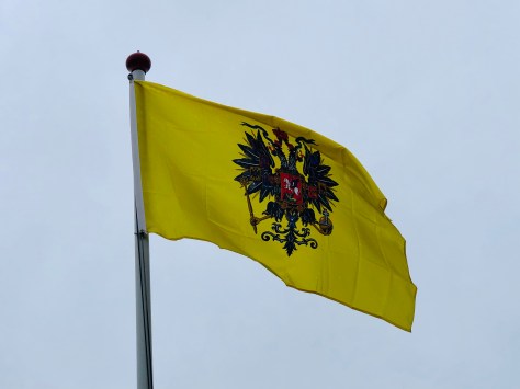 Het Russische Keizerrijk heeft verschillende vlaggen ‘versleten’ tijdens zijn bestaan, maar onder Nicolaas II was de vlag van vandaag gangbaar. De dubbelkoppige adelaar is al een oud Russisch symbool en gaat als zodanig al eeuwenlang mee. De twee koppen zijn gekroond met de keizerskroon, in de linkerklauw een scepter, in de rechtersklauw een rijksappel, samen met de kroon de symbolen van vorstelijke macht. Op het centrale wapenschild zien we een ridder te paard die een draak verslaat. Hoewel dit de bekende figuur Sint Joris zou kunnen voorstellen, wordt daar in de officiële beschrijving geen melding van gemaakt.