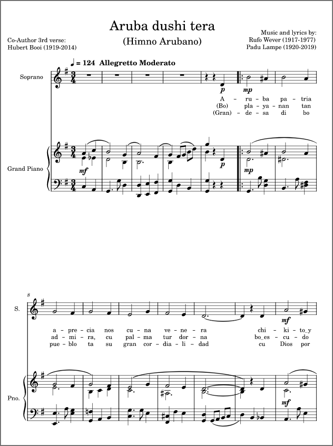 Op deze dag wordt het volkslied, zoals de naam van deze dag al doet vermoeden, ook gezongen. Het heet Aruba dushi tera (Aruba mooi land) en werd geschreven door Juan Chabaya Lampe op muziek van Rufo Wever.