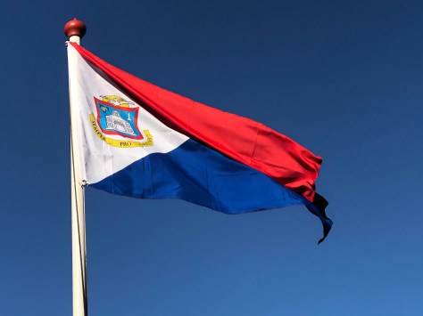 Om nog kort iets te zeggen over de Franse kant van het eiland: de officiële vlag hier is de Franse tricolore. Lokaal wordt er een onofficiële logo-vlag gevoerd.