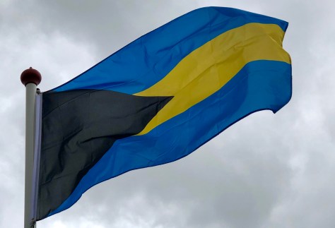 De vlag van de Bahama’s is een horizontale driekleur in aquamarijn, goudgeel en aquamarijn. Een zwarte driehoek wijst vanaf de broekingszijde naar de vluchtzijde.