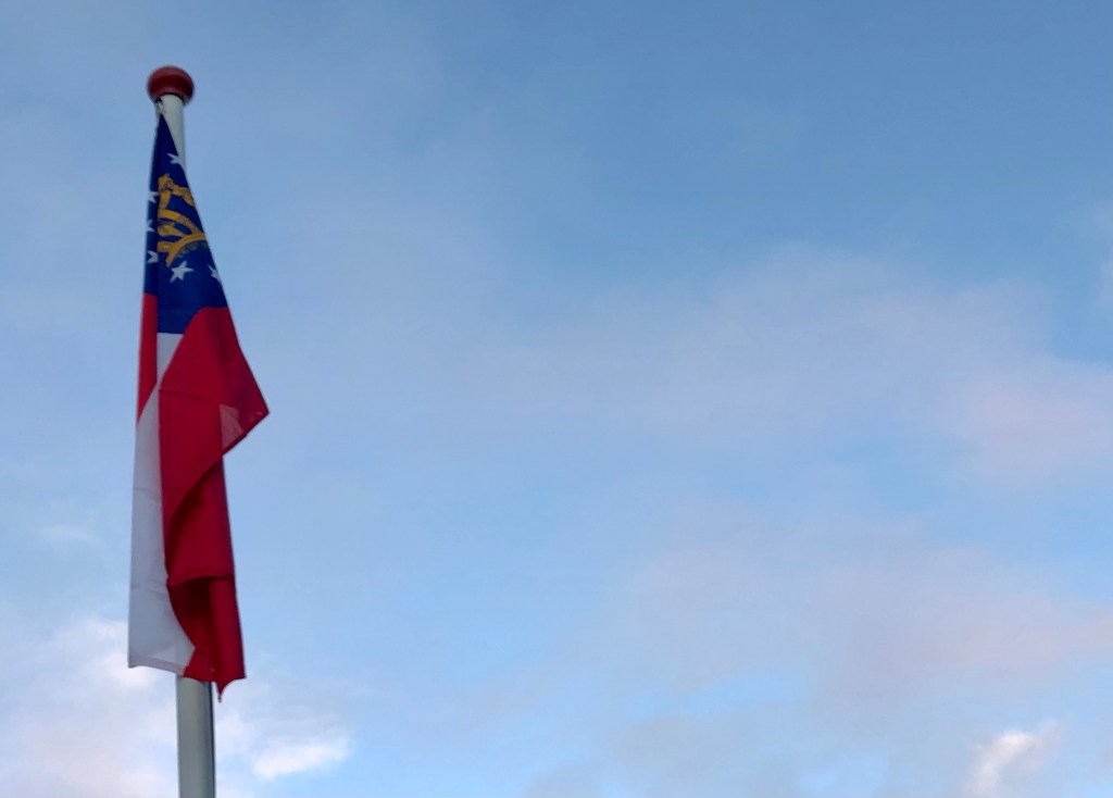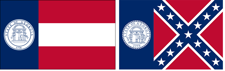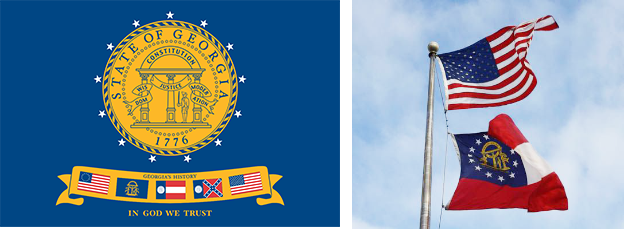 Hoewel Georgia dus een van de oudste staten is, heeft het een van de recentste vlaggen. De huidige vlag is ingevoerd in 2003 en is de 8e in een lange reeks. Het zou te ver voeren om ze hier allemaal te vermelden. De huidige vlag lijkt veel op de versie die tussen 1920 en 1956 werd gebruikt. In dat jaar werd een nieuwe vlag ingevoerd die tot jarenlange controverses, pijn en onenigheid zou leiden: op de vluchtzijde, die driekwart van de vlag in beslag nam, werd het symbool van de Geconfedereerde Staten van Amerika (de ‘Zuidelijken’) uit de Amerikaanse Burgeroorlog opgenomen, de zogenaamde Confederate Flag (Confederatievlag), een blauw schuinkruis waarop 13 witte sterren, geplaatst op een rood veld.