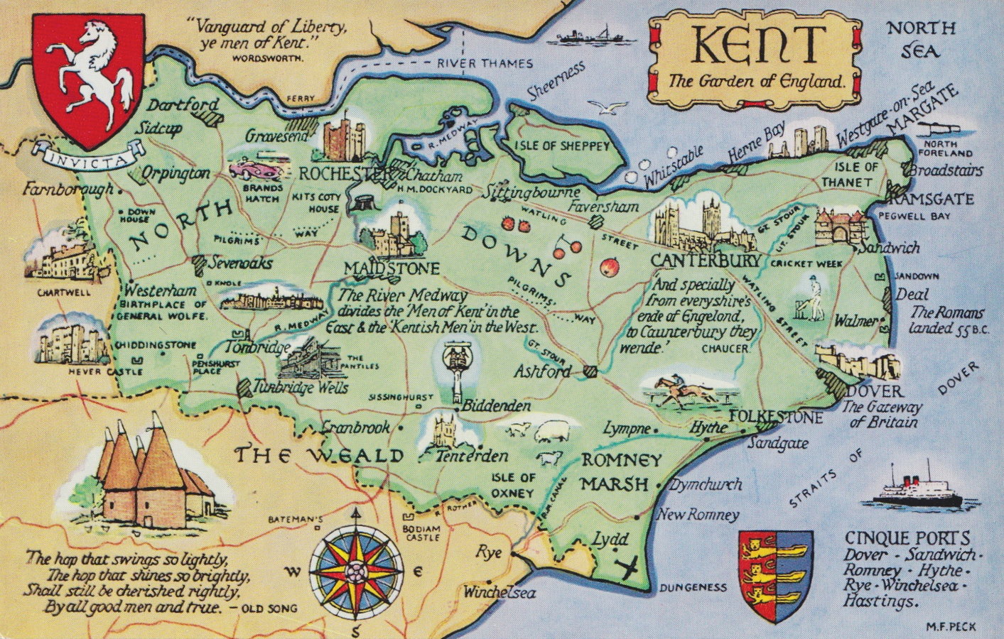 Kent, onze ‘buurprovincie’ bestaat onder die naam al heel lang. Vanaf 1067 was het al een deels autonoom gebied met als hoofstad Canterbury. Ver daarvoor was Kent zelfs een apart koninkrijk, volgens overlevering gesticht in 449 door de uit Jutland afkomstige Hengest, die het gebied veroverde, tesamen met zijn broer Horsa.