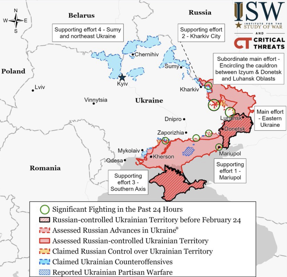 Volgens het Britse ministerie van Defensie is de strategie van de Russen erop gericht om vanuit Izjoem, in de Donbas, door te breken naar Kramatorsk en Severodonetsk, waardoor de Oekraïense troepen ingesloten zouden zijn.