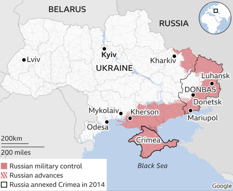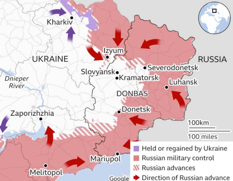 De laatste week is er door het Russische leger nauwelijks vooruitgang geboekt. Hieronder de sinds vorige week bijna ongewijzigde kaart met het front in de Donbas-regio en dat in het zuiden aan de kust.