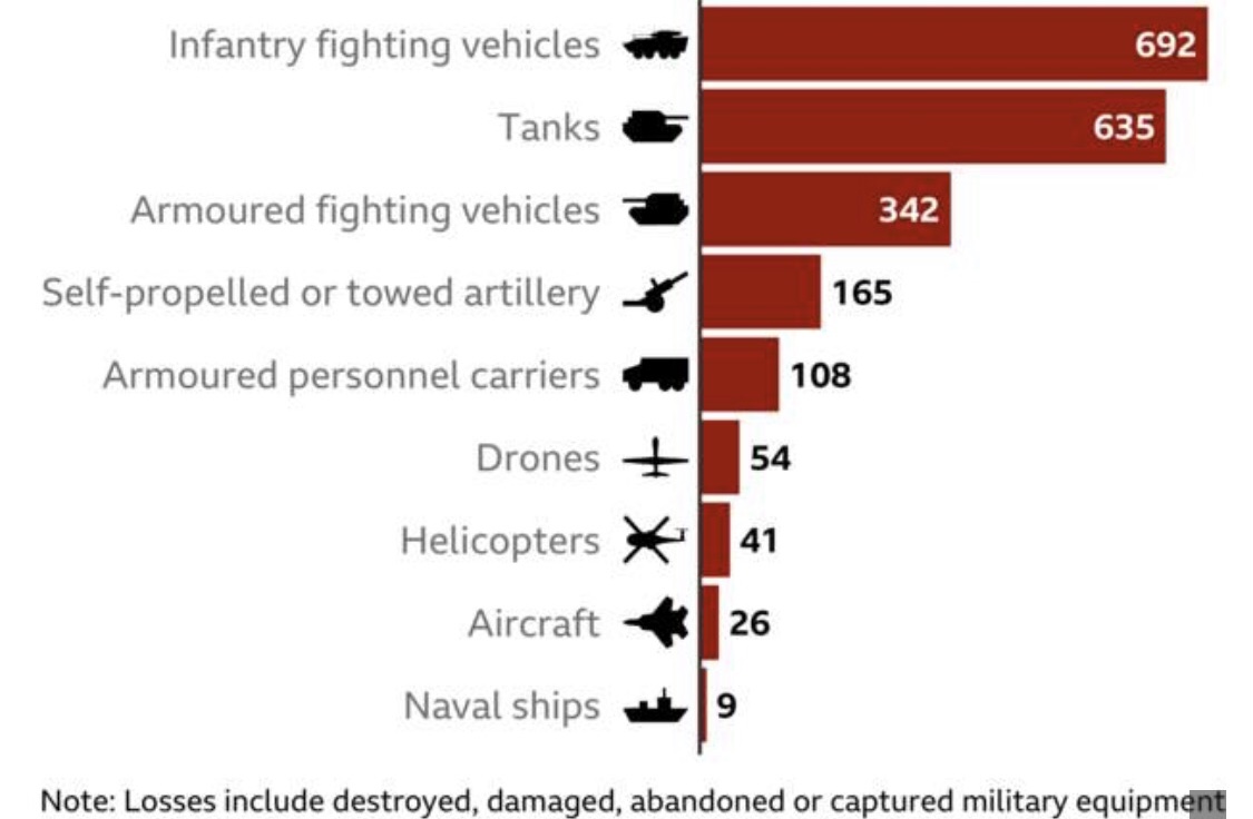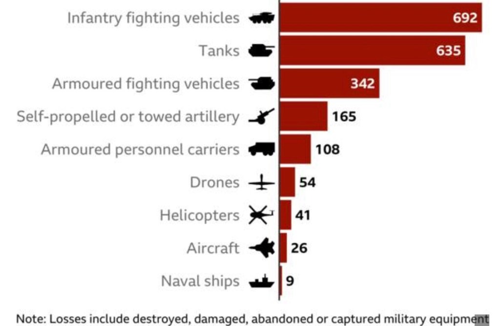 Het staatje laat zien dat de verliezen aanzienlijk zijn, met aan de top infanterie-gevechtsvoertuigen (692) en tanks (635), maar ook gepantserde gevechtsvoertuigen (342), helicopters (41), vliegtuigen (26) en marineschepen (9), waaronder het vlaggenschip de Moskva.