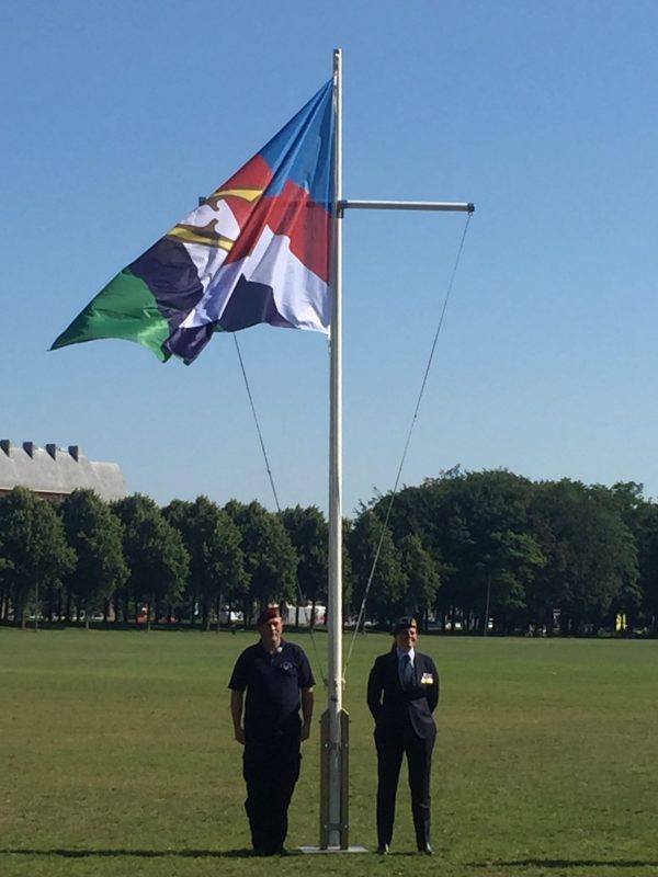 Het hijsen van de vlag op het Malieveld in Den Haag op Veteranendag vorig jaar, toen het wegens de coronapandemie niet groots gevierd kon worden (fotograaf onbekend)