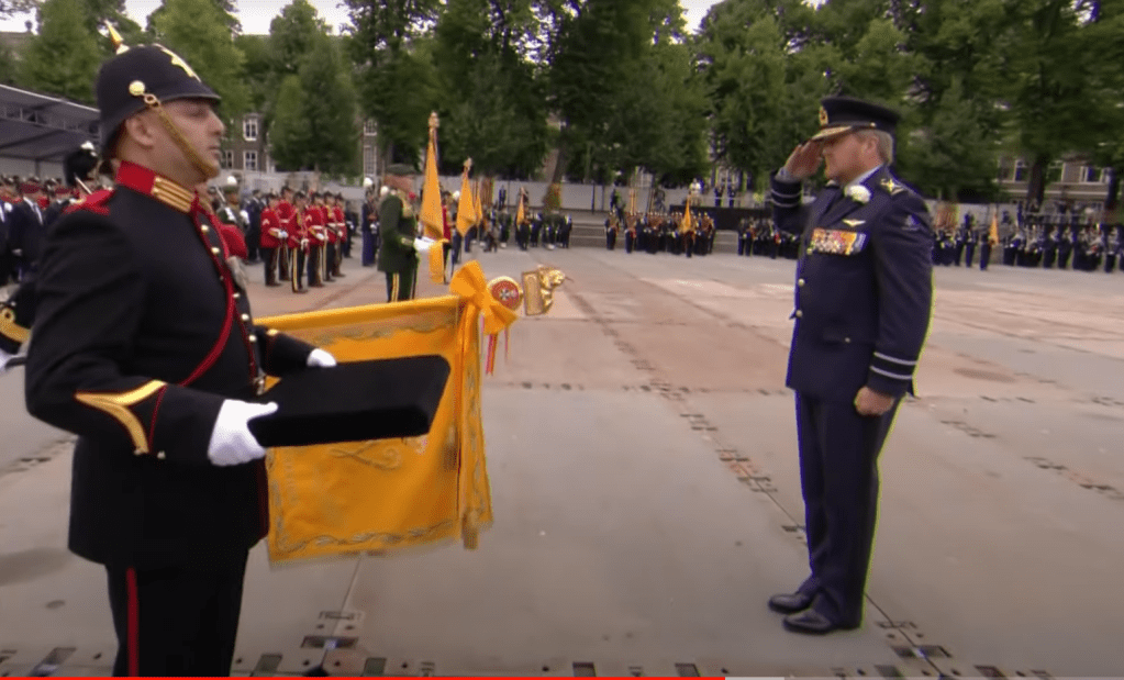 Koning Willem-Alexander, in luchtmachtuniform, salueert vaor het vaandel waaraan hij net daarvoor een cravate heeft vastgemaakt (screenshot)