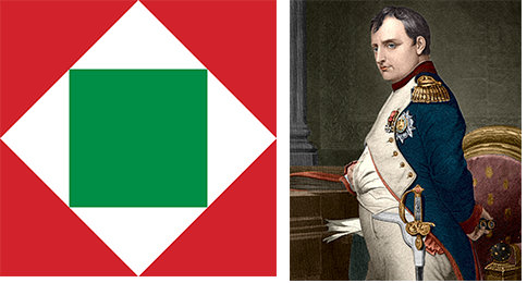 Links: Vlag van de Italiaanse Republiek (1802-1805) / Rechts: Napoleon Bonaparte (1769-1821), olieverfschilderij uit 1807 door Hippolyte Delaroche (1797-1856) (privécollectie)