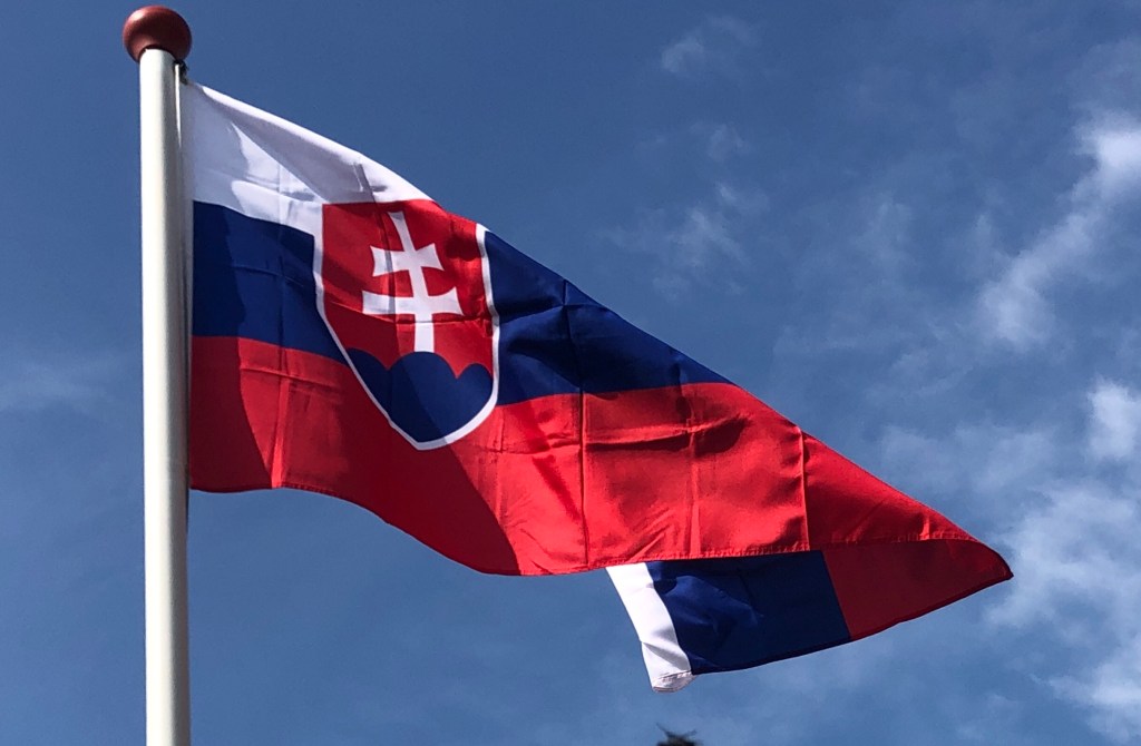 Links: Gekantelde vlag van Slowakije / Rechts: Vlag van de Slowaakse presidentHier zien we de nationale vlag samen met die van de president tijdens de inauguratie van Zuzana Čaputová (1973) als president van Slowakije op 15 juni 2019 (foto: Martin Medňanský)