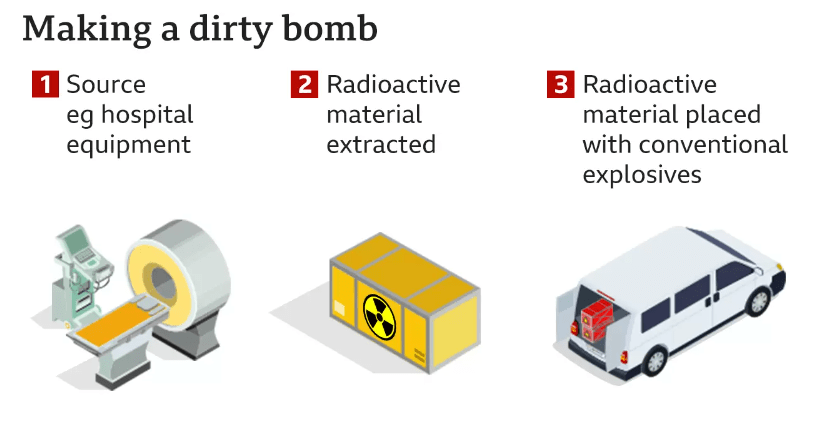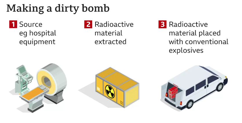 Een dergelijk explosief bevat nucleair materiaal, wat bij daadwerkelijk gebruik een flink gebied radioactief zou kunnen besmetten.