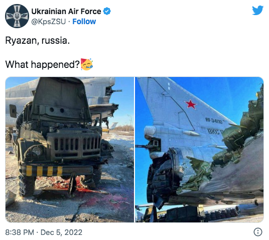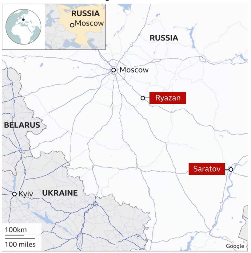Twee grote ontploffingen vonden plaats op de vliegbases van Engels (net buiten Saratov) en Dyagilevo (bij Ryazan), zo’n 500 km van de grens met Oekraïne.