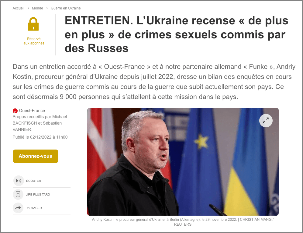 In een interview voor de Franse krant Ouest-France en de Duitse tegenhanger Funke, liet de Oekraïense procureur-generaal Andriy Kostin zich uit over seksuele wreedheden gepleegd door het Russische leger.