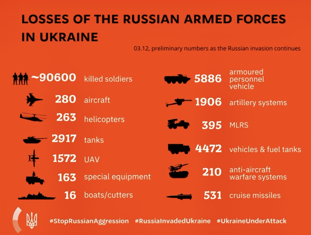 De cijfers kunnen niet onafhankelijk geverifieerd worden, maar volgens Oekraïne zou het gaan om plusminus 90.600 gesneuvelde militairen, 280 vliegtuigen, 263 helicopters, 2.917 tanks, 1.572 drones (UAV = Unmanned Aerial Vehicle), 163 stuks speciaal materieel, 16 schepen, 5.886 pantserinfanterievoertuigen, 1.906 artillerie-systemen, 395 stuks ‘multiple launch rocket systems’ (MLRS), 4.472 voertuigen en brandstoftanks, 210 stuks luchtafweergeschut en 531 kruisvluchtwapens.