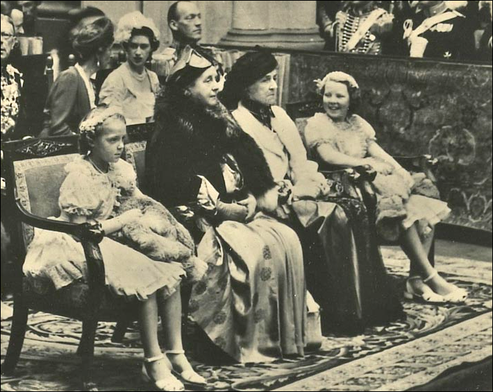 4 september 1948: Abdicatie van Koningin Wilhelmina, op deze foto gemaakt in de Nieuwe Kerk in Amsterdam zien we op de voorste rij v.l.n.r.: Prinses Irene (1939), Prinses Wilhelmina (1880-1962), Prinses Armgard zur Lippe Biesterfeld (moeder van Prins Bernhard) (1883-1971) en Prinses Beatrix; op de tweede rij: Koning Gustaaf VI Adolf van Zweden (1882-1973), zijn echtgenote Koningin Louise (1889-1965), Prinses Margaret van het Verenigd Koninkrijk (1930-2002) en Kroonprins (later Koning) Olav V van Noorwegen (1903-1991) (publiek domein)