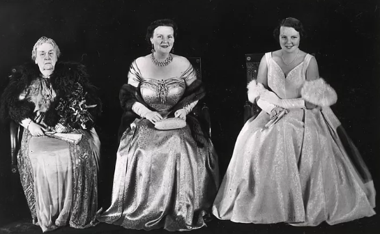 Om haar staatsrechtelijke meerderjarigheid te vieren bood de regering Drees Prinses Beatrix een officieel diner in het Paleis op de Dam in Amsterdam aan, waarbij Prinses Wilhelmina (links op de foto) voor het laatst in haar leven in gala verscheen, in het midden Koningin Juliana, 25 februari 1956 (fotograaf onbekend)