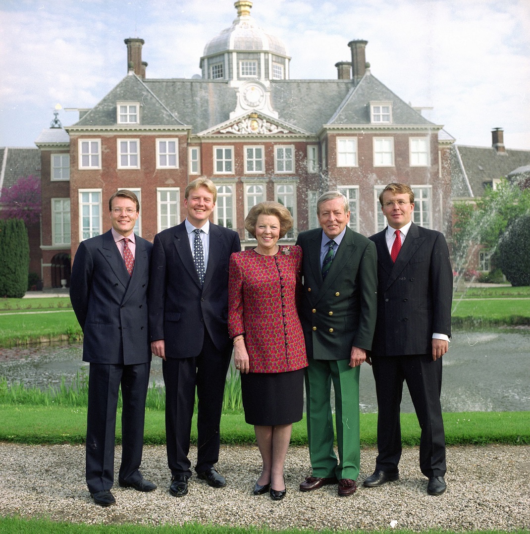 Het koninklijk gezin in 1998: v.l.n.r.: Prins Constantijn (1969), Kroonprins Willem-Alexander, Prins van Oranje (1967), Koningin Beatrix (1938), Prins Claus (1926-2002) en Prins Friso (1968-2013) (© RVD / Nationaal Archief)
