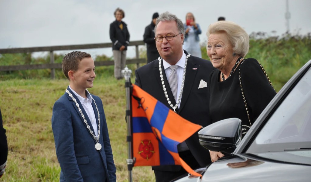 De koninklijke onderscheidingsvlag wordt ook als autovlaggetje gebruikt, zoals op deze foto goed te zien is; Prinses Beatrix bezoekt hier op 9 september 2022 als beschermvrouwe van Vereniging De Hollandsche Molen de Zevenhuizense Molenviergang, waarvan de oudste molen (Tweemanspolder Molen No.4) 300 jaar bestond, bij het uitstappen werd de prinses verwelkomd door burgemeester Hans Weber van Zevenhuizen en kinderburgemeester Thomas Schouten (foto: Judith Rikken)