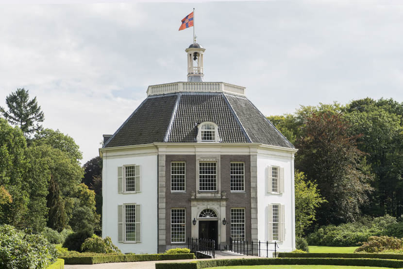 Prinses Beatrix’ thuisbasis, Kasteel Drakensteyn (1634) in Lage Vuursche met de koninklijke onderscheidingsvlag van Prinses Beatrix in top (fotograaf onbekend)