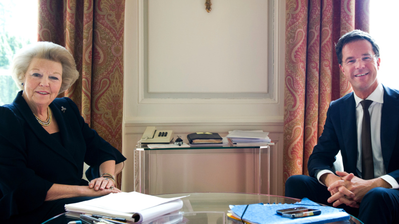 Koningin Beatrix’ laatste onderhoud met premier Mark Rutte in Paleis Huis ten Bosch, 22 april 2013, acht dagen voor haar abdicatie (RVD / foto: Frank van Beek)