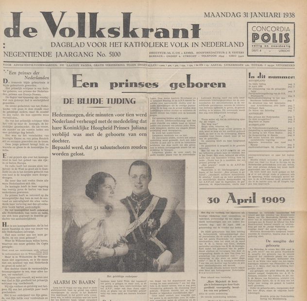 Voorpagina van de late editie van de Volkskrant van 31 januari 1938