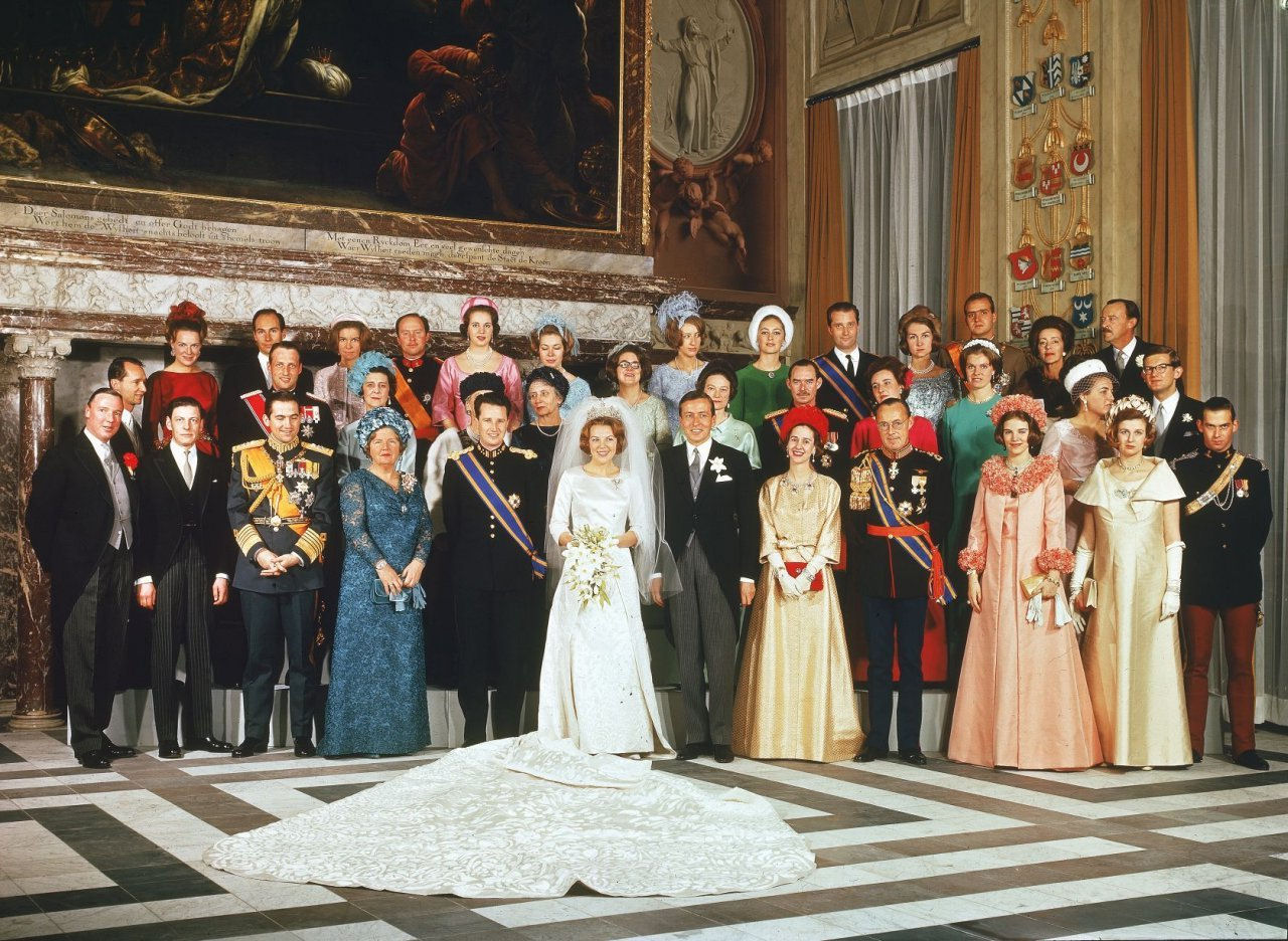 Huwelijksportret van Beatrix en Claus met hun gasten in het Paleis op de Dam in Amsterdam, 10 maart 1966, 1e rij v.l.n.r.: John Ambler (echtgenoot van Prinses Margaretha van Zweden), Angus Ogilvy (echtgenoot van Prinses Alexandra), Koning Constantijn van Griekenland, Koningin Juliana, Koning Boudewijn van België, het bruidspaar, Koningin Fabiola van België, Prins Bernhard, Koningin Anne Marie van Griekenland, Prinses Alexandra van Kent, Prins Michael van Kent; 2e rij: Prins Carel Hugo van Bourbon Parma (echtgenoot van Prinses Irene), Kroonprins Harald van Noorwegen, Prinses Marina (de Hertogin van Kent), Prinses Armgard zur Lippe Biesterfeld (de moeder van Prins Bernhard), Barones Gösta von dem Bussche-Haddenhausen (de moeder van Prins Claus), Prinses Christina, Groothertogin Joséphine Charlotte van Luxemburg, Groothertog Jan van Luxemburg, Prinses María del Pilar van Bourbon (Infante van Spanje), Prinses Margaretha van Zweden, Prinses Margriet, Mr. Pieter van Vollenhoven; 3e rij: Prinses Irene, Aga Khan Shah Karim al-Husseini, Prinses Irene van Griekenland, Prins Charles van Luxemburg, Prinses Benedikte van Denemarken, Prinses Christina van Zweden, Christina von Amsberg (zuster van Prins Claus), Prinses Paola van België, Prins Albert van België, Prinses Sophia van Griekenland (de echtgenote van Prins Juan Carlos), Prins Juan Carlos van Bourbon van Spanje, Prins Aschwin zur Lippe Biesterfeld (broer van Prins Bernhard) (© RVD / foto: Max Koot)