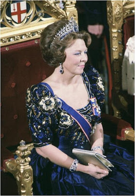 Koningin Beatrix tijdens haar staatsbezoek aan het Verenigd Koninkrijk, november 1982, ze draagt hier bij een officiële ontvangst in de Guildhall te Londen, de Mellerio saffierdiadeem die Koning Willem III in 1881 aanschafte voor zijn tweede echtgenote Koningin Emma