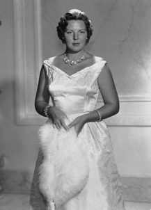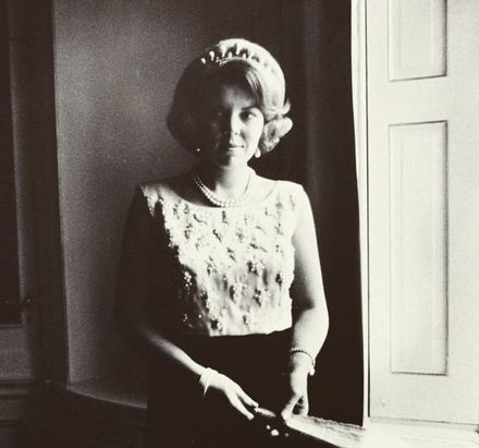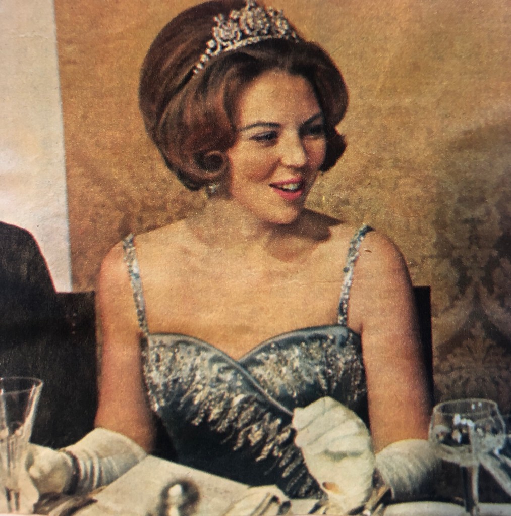 Op zaterdag 5 maart 1966 bood de regering Cals Beatrix en Claus een galadiner aan in het Prinsenhof in Delft, de prinses draagt hier Koningin Emma’s diamantdiadeem uit 1890 (fotograaf onbekend)