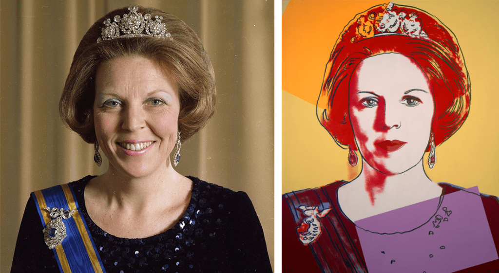 Links: Inhuldigingsportret van Koningin Beatrix, 30 april 1980 (© RVD) / Rechts: Andy Warhol (1928-1987) gebruikte deze foto voor zijn serie “Reigning Queens” uit 1985, het betrof een serie zeefdrukken van de vier toentertijd regerende koninginnen, naast Beatrix ging het om Koningin Elizabeth II van het Verenigd Koninkrijk, Koningin Margrethe II van Denemarken en Koningin-Regentes Ntfombi Twala van Swaziland (het tegenwoordige Eswatini), van iedere koningin maakte hij vier verschillende versies in verschillende kleurstellingen, Warhol vond het portret van Beatrix het geslaagdst: “The best looking one of the whole bunch!” (publiek domein)