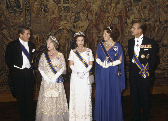 Tijdens het staatsbezoek aan het Verenigd Koninkrijk in november 1982, liet Prins Claus vanwege zijn klachten enkele programma-onderdelen schieten, screenshot voorafgaand aan een diner in Hampton Court Palace,waarbij hij wél aanwezig was, v.l.n.r.: Prins Claus, Koningin-moeder Elizabeth, Koningin Elizabeth II, Koningin Beatrix en Prins Philip, de Hertog van Edinburgh (screenshot)