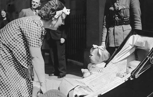 Kroonprinses Juliana met dochters Beatrix en Irene op 14 mei 1940, net na de vlucht naar Londen (publiek domein)