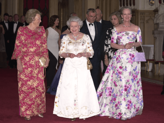 Drie regerend koninginnen bij elkaar (Beatrix, Elizabeth en Margrethe) tijdens de viering van het gouden jubileum van Koningin Elizabeth II van het Verenigd Koninkrijk in Windsor Castle in 2002 (screenshot)