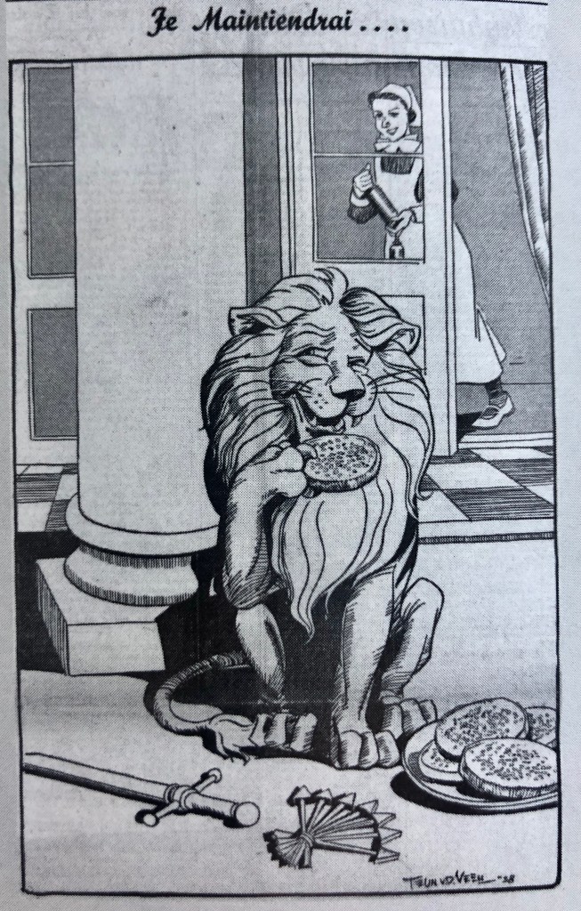 De leeuw uit het Nederlandse wapen heeft zijn attributen even terzijde gelegd om beschuit met muisjes te kunnen eten, op een iIllustratie van Teun van der Veen (1902-1992) (publiek domein)
