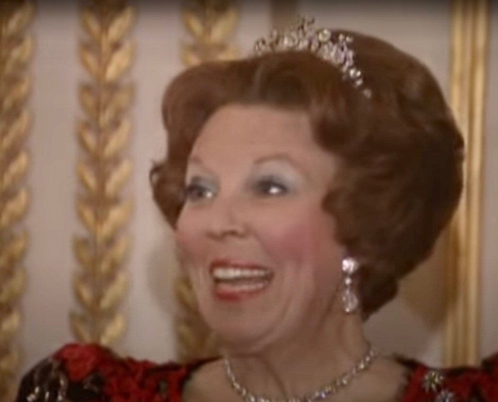 Koningin Beatrix begroet gasten voorafgaand aan een galadiner in Parijs, tijdens haar staatsbezoek aan Frankrijk, maart 1991 (screenshot)