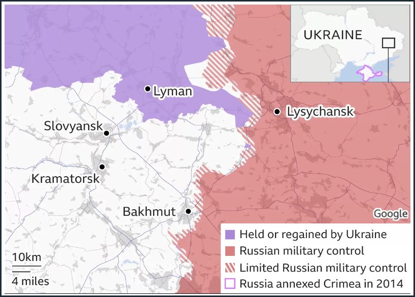 Bachmoet ligt in de oblast Donetsk, in de door Rusland illegaal geclaimde Donbas-regio.