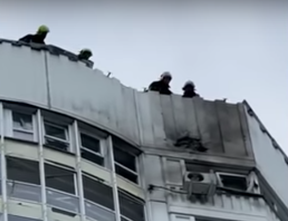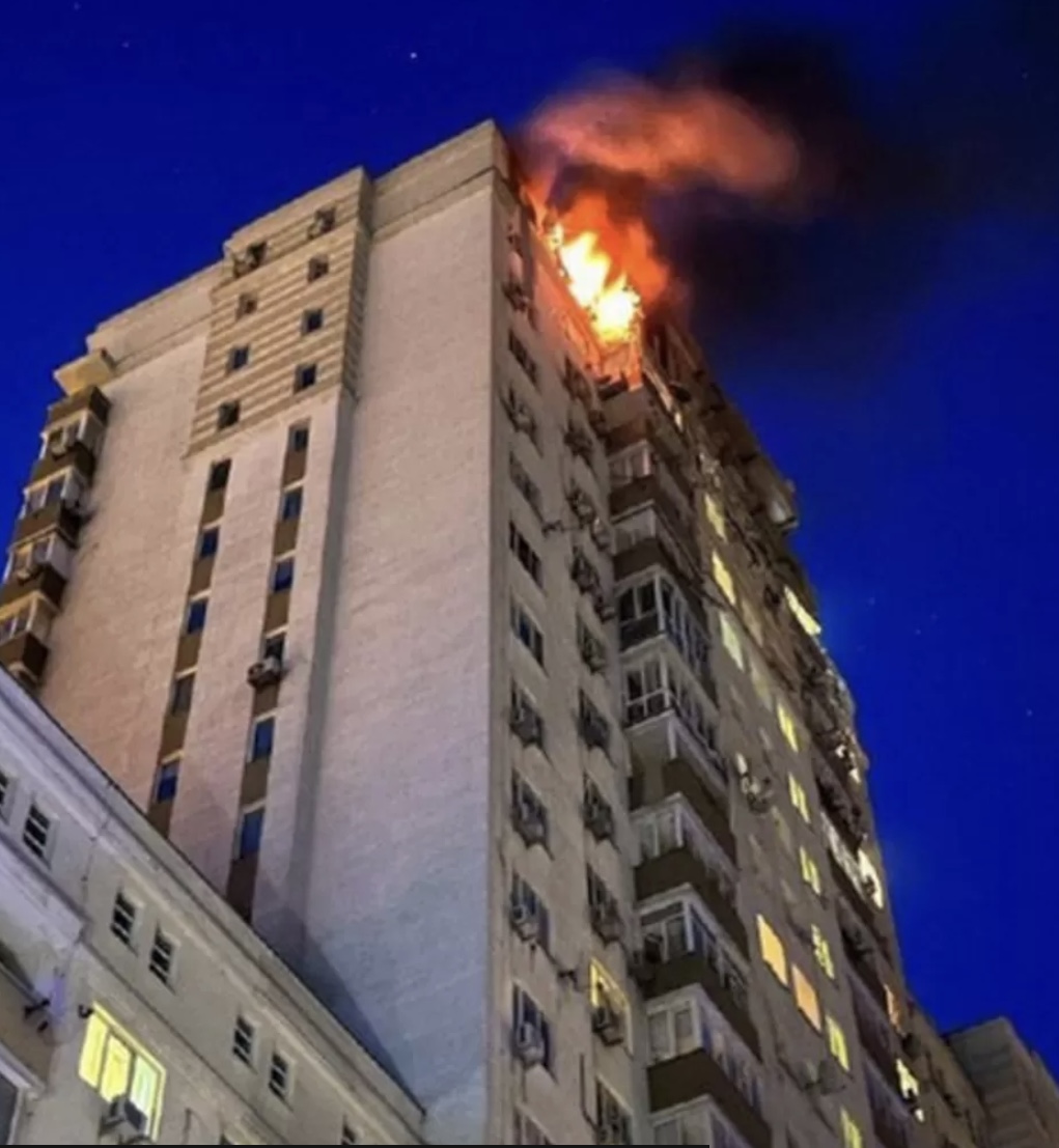 Na geraakt te zijn door vallende brokstukken van een neergehaalde drone, brak er brand uit in de bovenste woonlagen van een flat in de wijk Holosiivskyi, in het zuiden van Kiev (foto: Kyiv City Military Administration)